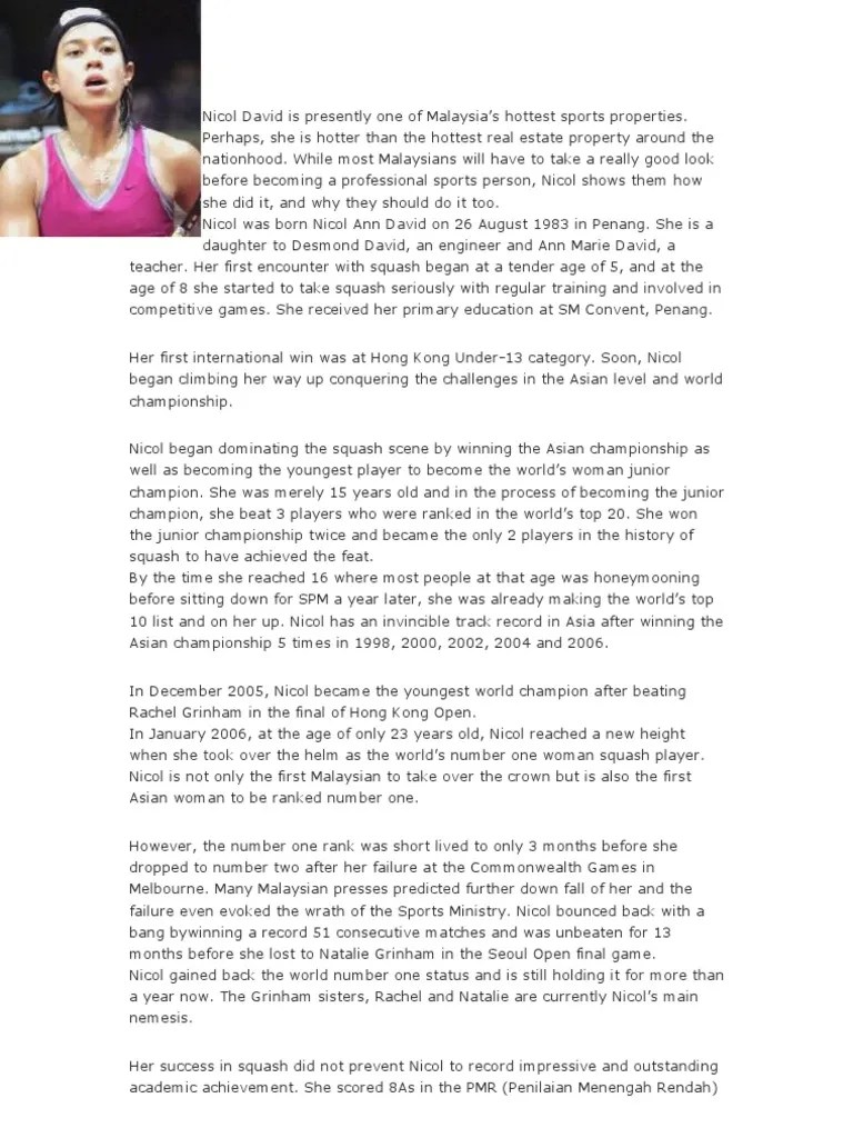 Slaid petikan sumbangan wira negara. Datuk nicol ann david db pjn dspn kmn amn (born august 26, 1983) is a retired female malaysian professional squash player. Beginning in august 2006, david was the world . Nicol david was born on august 26, 1983, in penang, malaysia, to desmond david, a malaysian indian engineer and former state athlete, and his wife, ann marie . August 1983 in penang) ist eine ehemalige malaysische squashspielerin.